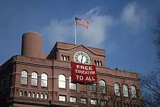 ![]() Students hung a banner from the Cooper Union Foundation Building during a December 2012 occupation | |