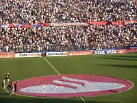 The logo of Banco Santander displayed on the field of Estadio Gran Parque Central, 2010