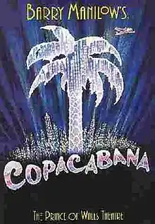 Copacabana, also known as Barry Manilow's Copacabana, is a 1994 stage musical with music by Barry Manilow, lyrics by Bruce Sussman and Jack Feldman, and book by Manilow, Sussman and Feldman. The show had its roots in an hour-long stage show, Barry Manilow Presents Copacabana, which played in Atlantic City in 1990 and 1991. The stage show was based on the 1985 musical TV film of the same name, which in turn was based on Manilow's 1978 hit song of the same title, which was co-written by Manilow, Sussman and Feldman. The full-length musical, which added a present-day framing device and many additional songs, premiered in the United Kingdom in 1994 and later toured the United States.[1] A cast album of the musical was released in 1994, titled Copacabana: Original London Cast Recording.