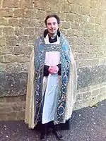 An Anglican priest wearing a cope over cassock, surplice and stole.