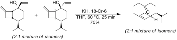 In its original implementation, the oxy-Cope reaction required high temperatures. Subsequent work showed that the corresponding potassium alkoxides rearranged faster by 1010 to 1017. By virtue of this innovation, reaction proceed well at room temperature or even 0 °C. Typically potassium hydride and 18-crown-6 are employed to generate the dissociated potassium alkoxide: [9]