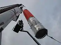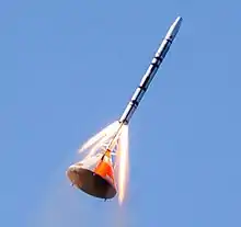 The SMARAGD rocket (emerald in Danish) is a 5.7 meter[30] two-stage rocket weighing 160 kg, intended to reach an altitude of 8 km,[31] that was used for testing various technological aspects of the operation. On July 27, 2012, the team set out from Nexø towards the launch site, intending to launch the SMARAGD rocket.[32][33] After some initial problems with the remote launch control,[34] the rocket launched successfully just after 1 pm[35][36] and reached the maximum altitude of 8.2 km.[37] It was evident shortly after take off that the nosecone, containing electronics, broke off during launch, possibly due to the large acceleration of estimated 20 g.[38]