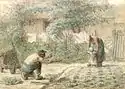 ![]() First Steps ca. 1858 Lauren Rogers Museum of Art, Laurel, Mississippi | ![]() First Steps 1890 The Metropolitan Museum of Art, New York (F668) | Van Gogh used a photograph of the original painting for this work.[45] Rather than vibrant colors, here he used softer shades of yellow, green and blue. The picture depicts the father, having put down his tools, holding his arms outstretched for his child's first steps. The mother protectively guides the child's movement.[46] |
