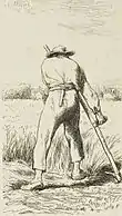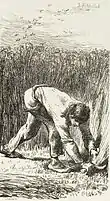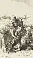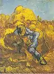 ![]() | ![]() Peasant Woman Binding Sheaves 1889 Van Gogh Museum, Amsterdam, Netherlands (F700) | In Peasant Woman Binding Sheaves (after Millet) Van Gogh's work shows it is beautiful for its simplicity and appreciation of nature. The woman's expression is hidden to us and appears like one of the waiting bundles of wheat. The true focus of the scene is the woman's bent back.[54] |