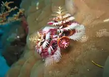 The sea hosts numerous species of anemones, sponges, worms (e.g. Spirobranchus giganteus shown in the photograph), gastropods, lobsters, crayfish, prawns and crabs. Red algae Lithothamnion and Porolithon colour many coral reefs purple-red and the green alga Halimeda is found throughout the sea. The coastal plants consisting of only about 30–40 species, and mangroves occur in the northern part of the sea.[9] Four hundred coral species, both hard corals and soft corals inhabit the reefs.[21] The majority of these spawn gametes, breeding in mass spawning events that are triggered by the rising sea temperatures of spring and summer, the lunar cycle, and the diurnal cycle. Reefs in the inner GBR spawn during the week after the full moon in October, while the outer reefs spawn in November and December.[22] Its common soft corals belong to 36 genera.[23] There are more than 1500 fish species in the reef systems.[24] Five hundred species of marine algae or seaweed live on the reef,[21] including thirteen species of the genus Halimeda, which deposit calcareous mounds up to 100 metres (110 yd) wide, creating mini-ecosystems on their surface which have been compared to rainforest cover.[25]