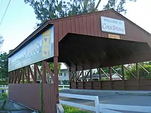 The Coral Springs Covered Bridge is a 40 ft covered bridge located in Coral Springs, Florida and was the first permanent structure built in the city. The only publicly accessible covered bridge in Florida, it has also been honored with a Florida Heritage Site Marker.