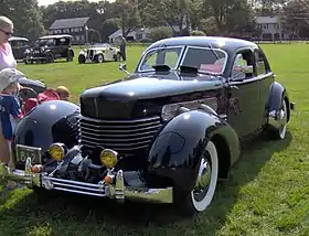 It also featured a concealed lockable fuel filler door and variable-speed windshield wipers[1] (at a time when wipers were often operated by intake vacuum, and so tended to stop when the driver stepped on the gas pedal). Its engine-turned dashboard included complete instrumentation, a tachometer, and standard radio[1] (which did not become an industry standard offering until well into the 1950s).[9] The most famous feature was the "coffin nose", a louvered wraparound grille, from which its nickname derived,[1] a product of Buehrig's desire not to have a conventional grille.