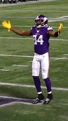 Patterson had an opportunity to reacquire his starting position after veteran wide receiver Greg Jennings was released during the off-season.[53] After newly signed veteran Mike Wallace established himself as the starter and rookie Stefon Diggs emerged as a premier receiver in Charles Johnson's absence, Patterson was dropped to fifth position and relegated to return duties. He received minimal play at wide receiver throughout the season, only amounting two receptions all season. However, he had two kick return touchdowns, the first in Week 10 against the Oakland Raiders and the second in Week 13 against the Seattle Seahawks.[54][55][56]