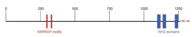 The WH2 domain is an ~18-21 amino acids actin-binding motif. This domain was first recognized as an essential element for the regulation of the cytoskeleton by the mammalian Wiskott-Aldrich syndrome protein (WASp) and is present in at least 6 classes of proteins WIP/Verprolin, Cibulot, Svv2/CAP, β-Thymosines, WAVE/Scar.[18] WH2 proteins occur in eukaryotes from yeast to mammals, in insect viruses, and in some bacteria. The WH2 domain is found as a modular part of larger proteins and can occur as a tandem repeat. The WH2 domain binds actin monomers and can facilitate the assembly of actin monomers into newly forming actin filaments.[19]