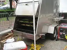 A corn roaster is a large grill for cooking large batches of ears of corn at the same time. The term "corn roaster" can also refer to a person who roasts corn.[1][2][3] Corn roaster machines have existed in the United States since at least 1900.[4] Corn roasters are used by concession vendors at festivals, fairs, events, parties and holidays, such as the Fourth of July in the United States.[5][6] Roasted corn is a very popular festival food in the American South, Southwest and Northwest. Corn roasters can also cook foods such as turkey legs potatoes and sweet potatoes. They may also be used by street food vendors.[7][8] Street vendors may operate seasonally, per the seasonality of corn crops.[8] Some organizations that operate corn roasters at events, such as fairs, donate their proceeds to charities.[9]