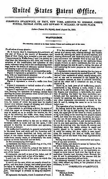On August 24, 1869, Swartwout was awarded a US patent for an "Improvement in Waffle-Irons", consisting of a novel handle for opening, closing and turning a stovetop waffle iron. His invention looked nothing like modern electric models. Fashioned to sit on wood or gas stoves, the cast-iron plates were joined by a hinge that swiveled in a cast-iron collar.[3]