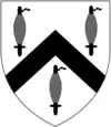 Argent, a chevron between three spindles sable | |