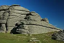 The main rock forming the batholith is granite, which formed when magma cooled slowly, covered by 2–3,000 metres of slate and sandstone. The slow cooling gave time for crystals to form in the granite which are large enough to see with the naked eye, giving it a granular appearance. These grains are mainly of quartz, feldspar and biotite.[5][27] The granite is generally coarse grained and in some places very coarse-grained, or pegmatitic (grains larger than 3 cm). Large phenocrysts, several centimetres long, of K-feldspar, are a distinctive feature.[28]