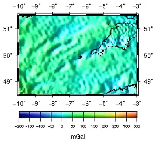 A batholith is a large mass of intrusive rock formed from the crystallization of molten rock beneath the Earth's surface (magma). From gravity and magnetic geophysical data, the batholith is interpreted to extend from about 8°W, more than 100 km southwest of the Isles of Scilly, to the eastern edge of Dartmoor. The negative gravity anomaly, caused by the relatively low density of the granites compared to average continental crust, is linear and trends WSW-ENE, parallel with that associated with the Haig Fras granite.[1]