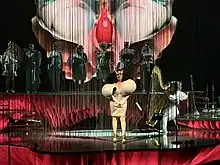 In an interview with Vogue Magazine set designer Chiara Stephenson revealed that "Björk wanted Cornucopia to be both intensely intimate, as though the audience could feel her whispering in their ear, and vast, voyeuristic and distant,".[25] The designer was inspired by natural shapes to create the setting for the show, saying "Natural forms are at the heart... whether the intricate beauty of fungi or the grand wonder of the cosmos, there was no part of reality too big or small to consider. In the same way, Björk’s music is so personally and emotionally raw, it takes you deep into your own life experience, but is also about the human condition in general."[25] Stephenson went on to say that she sees no separation between high and low culture and sees Björk as a "brilliant example" of someone who can "confidently" move between both worlds.[25] She also detailed how the stage would use a surround sound system that syncs with a surround lighting, to give the audience the feeling of being surrounded by the music and the stage.[25] Steve Jones from d&b audiotechnik explained that "Björk wanted the sound for Cornucopia to create an otherworldly sensory experience that draws the visual, aural and virtual elements together and utilizing Soundscape, from the studio composition scenario all the way through to the show performance scenario has delivered of that vision".[26] Craig Jenkins of Vulture describes the stage by saying that "[the stage] gives the appearance of an outgrowth of oyster mushrooms, one for the singer and her harp player, Katie Buckley; another for drummer and percussionist, Manu Delago; a third for the storied Icelandic producer Bergur Þórisson; and a fourth for the flute septet, Viibra. A screen behind the flutes pumps in visuals, sometimes mined from the music videos and sometimes not, while complementary videos are displayed on either side of the band and projected on a series of translucent curtains at the front of the stage".[5]