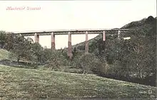 A Class A viaduct 101 feet (31 m) high and 486 feet (148 m) long on 7 piers. It was replaced by a new stone viaduct on 14 September 1898.[34] An accident happened on 15 November 1897 during this reconstruction work. A rope gave way while five men were hoisting a wooden beam up onto the new viaduct. One of them let go of his rope too soon, as a result the beam swung free and knocked two of the gang to their deaths.[35]