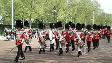A Corps of Drums, also sometimes known as a Fife and Drum Corps, Fifes and Drums or simply Drums is a unit of several national armies. Drummers were originally established in European armies to act as signallers.[1] The major historical distinction between a military band and a corps of drums, was that 'drummers' were not employed to play their instruments to entertain or delight, but rather they carried out a utilitarian battlefield role. This role was fulfilled by trumpeters or buglers in the cavalry and the artillery, who did not form into comparative formed bodies in the way that drummers did; therefore, an orthodox corps of drums will exist in the infantry arm.