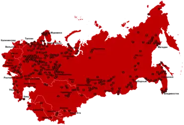 In Soviet Russia, there were five types of forced labour camps: special purpose camps, general concentration camps, production camps, prisoner of war camps, and distribution camps.[5] However, in the documents of the People's Commissariat of Internal Affairs, the terms "forced labour camp" and "concentration camp" were often used interchangeably; there is also the name "concentration labour camps",[6] so most likely this division into types was largely formal. In addition, when necessary (for example, when the Tambov Uprising was suppressed), temporary field camps were organized.[7]