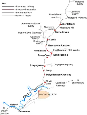 | Connections | Ratgoed Tramway at Aberllefenni Cambrian Railways at Machynlleth Assorted minor quarry tramways | ||||||||||||||||||||||||||||||||||||||||||||||||||||||||||||||||||||||||||||||||||||||||||||||||||||||||||||||||||||||||||||||||||||||||||||||||||||||||||||||||||||||||||||||||||||||||||||||||||||||||||||||||||||||||||||||||||||||||||||||||||||||||