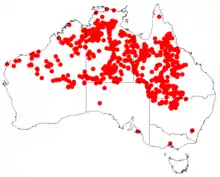 This eucalypt occurs in arid and seasonally dry areas of the Northern Territory, Queensland, the north-west of New South Wales and the extreme north of South Australia. Corymbia opaca, sometimes included in C. terminalis, is found in the northern half of Western Australia.[4][11] The tree typically grows on river flats, scree slopes and dune swales.[11] It prefers well drained soils and is both drought and frost tolerant.[12]
