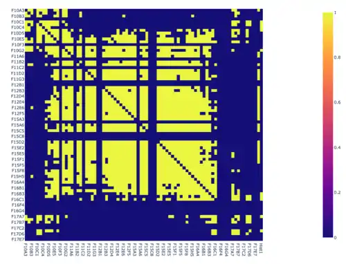 A heat map is a visual representation of a matrix of m × n that can show different phenomenons on a 2-Dimensional scale. Heat maps have a range of color intensities based on the values and scale given from the data. Coding-wise, heat maps can be created using libraries such as plotly.express in Python. Using co-segregation, heat maps are used to visualize a matrix that contains values of either 1 or 0 to visualize the commonalities between 2 or more variables. "The primary benefit of using heat maps is that they make otherwise dull or impenetrable data understandable. Many people understand heat maps intuitively, without even needing to be told that those warmer colors indicate a denser focus of interactions."[8]