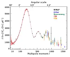 Inspired by the COBE results, a series of ground and balloon-based experiments measured cosmic microwave background anisotropies on smaller angular scales over the next decade. The primary goal of these experiments was to measure the scale of the first acoustic peak, which COBE did not have sufficient resolution to resolve. This peak corresponds to large scale density variations in the early universe that are created by gravitational instabilities, resulting in acoustical oscillations in the plasma.[41] The first peak in the anisotropy was tentatively detected by the Toco experiment and the result was confirmed by the BOOMERanG and MAXIMA experiments.[42][43][44] These measurements demonstrated that the geometry of the universe is approximately flat, rather than curved.[45] They ruled out cosmic strings as a major component of cosmic structure formation and suggested cosmic inflation was the right theory of structure formation.[46]
