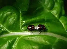 Cosmopepla lintneriana, the twice-stabbed stink bug, locally called the wee harlequin bug (particularly in Alberta), is a species of insect in the family Pentatomidae. Cosmopepla lintneriana was first described in 1798 by Johan Christian Fabricius as Cimex carnifex, and then again in 1865 by Thomas Say as Cosmopepla bimaculata.[1][2] Cosmopepla lintneriana is hosted by a variety of plants, including milk thistle, echinacea, asparagus, oats, mint and goldenrod,[3] and is widespread throughout North America, from Canada to Mexico. Adult C. lintneriana are black with a red, orange, or yellow band across the pronotum and a short red stripe along the midline, and two red spots at the apex of the scutellum.[4] Nymph coloration ranges from red to white with black markings that change as they grow.[5]
