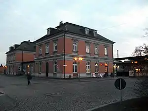 The station building from 1894 is a brick building with Renaissance Revival and eclectic elements with stone-accented corners, cornices and window surrounds and it has some Art Nouveau elements.