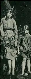Elsie's father, Arthur, was a keen amateur photographer, and had set up his own darkroom. The picture on the photographic plate he developed showed Frances behind a bush in the foreground, on which four fairies appeared to be dancing. Knowing his daughter's artistic ability, and that she had spent some time working in a photographer's studio, he dismissed the figures as cardboard cutouts. Two months later the girls borrowed his camera again, and this time returned with a photograph of Elsie sitting on the lawn holding out her hand to a 1-foot-tall (30 cm) gnome. Exasperated by what he believed to be "nothing but a prank",[3] and convinced that the girls must have tampered with his camera in some way, Arthur Wright refused to lend it to them again.[4] His wife Polly, however, believed the photographs to be authentic.[3]