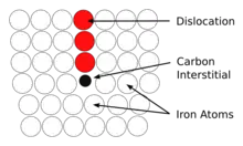 Cottrell atmospheres occur in body-centered cubic (BCC) and face-centered cubic (FCC) materials, such as iron or nickel, with small impurity atoms, such as boron,[2] carbon,[3] or nitrogen. As these interstitial atoms distort the lattice slightly, there will be an associated residual stress field surrounding the interstitial. This stress field can be relaxed by the interstitial atom diffusing towards a dislocation, which contains a small gap at its core (as it is a more open structure), see Figure 1. Once the atom has diffused into the dislocation core the atom will stay. Typically only one interstitial atom is required per lattice plane of the dislocation. The collection of solute atoms around the dislocation core due to this process is the Cottrell atmosphere.
