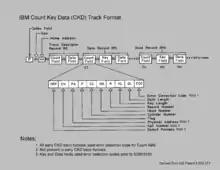 Count key data (CKD) is a direct-access storage device (DASD)[lower-alpha 1] data recording format introduced in 1964, by IBM with its IBM System/360 and still being emulated on IBM mainframes. It is a self-defining format with each data record represented by a Count Area that identifies the record and provides the number of bytes in an optional Key Area and an optional Data Area. This is in contrast to devices using fixed sector size or a separate format track.