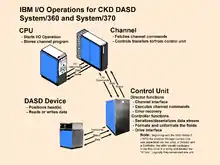 Initially there was a high degree of correspondence between the logical view of DASD accesses and the actual hardware, as shown in the illustration above. Three digit labels were typically affixed[lower-alpha 6] to identify the address of channel, control unit and device.