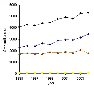 Graph showing unadjusted gross value added (GVA) in County Durham across 3 industries at current basic prices from 1995 to 2004.