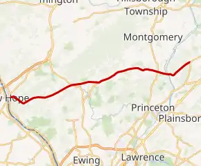 At Stoutsburg, CR 518 crosses the Keith line and continues into Montgomery Township, Somerset County, passing farms, woods, and residential subdivisions. The road crosses CR 601, at which point it turns to the east and continues to an intersection with US 206/CR 533 a short distance north of Princeton Airport in a commercial area. East of US 206/CR 533, the route enters Rocky Hill, where the name becomes Washington Street, and passes wooded residential areas, intersecting CR 605 in the center of the community. From this point, CR 518 enters woodland and crosses the Millstone River, where it enters Franklin Township and becomes Georgetown-Franklin Turnpike. Immediately following the Millstone River, the road crosses the Delaware and Raritan Canal and reaches the CR 603 intersection. The route ascends Ten Mile Run Mountain and passes through more forests to the north of a quarry, climbing a steep hill, and curves to the northeast, flattening out into a mix of farms, woods, and homes. CR 518 reaches its eastern terminus at an intersection with Route 27 (though which the border between Franklin Township, Somerset County and South Brunswick, Middlesex County runs).[1][4]