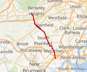 It continues north through Edison and South Plainfield. The route passes near Putnam Park and intersects CR 602 (also the terminus of unsigned CR 509). It crosses into Plainfield, Union County traveling near Cedar Brook Park and Plainfield High School. County maintenance of the road ends at 9th Avenue in Plainfield while the city-maintained CR 531 continues northeast through downtown Plainfield along Park Avenue. In the center of the city's business district, it intersects Route 28 and provides access to Plainfield station. Upon crossing Green Brook into North Plainfield, Somerset County, county maintenance of the route resumes and the road name becomes Somerset Street. The mainline of CR 531 jogs to the east for one block at Pearl Street before turning northwest onto Watchung Avenue.[1] However, Somerset Street is a borough-maintained alternate route of CR 531 which travels through the central business district of North Plainfield.[4][5]