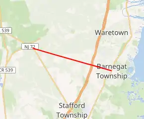 County Route 554 (CR 554) is a county highway in the U.S. state of New Jersey. The highway extends 6.07 miles (9.77 km) from Barnegat Boulevard (Route 72) to Main Street (U.S. Route 9 or US 9) in Barnegat Township. The highway was designated as the easternmost segment of CR 532 in the early 1950s[2] and was later a portion of CR 534, but as it had no connection to the western segment, it was renamed by 1984.[3]