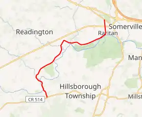 CR 567 begins at an intersection with CR 514 in Hillsborough Township, heading north on two-lane undivided River Road (also known as Neshanic Station Road). The road runs through wooded areas before heading along the east bank of the South Branch Raritan River, intersecting CR 667 and passing under Norfolk Southern's Lehigh Line. The route runs near farms as it crosses the river and enters Branchburg Township. At this point, CR 567 intersects CR 667 again and becomes Pleasant Run Road before making a northeast turn onto South Branch Road, with CR 628 continuing northwest along Pleasant Run Road. Residential development increases as the route continues northeast and passes the Neshanic Valley Golf Course. CR 567 begins to run closer to the South Branch Raritan River again as it reaches a junction with CR 620. CR 567 passes north through some farm fields before turning northeast at an intersection with CR 646.[1][4]