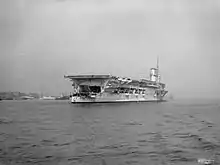 The ship was reduced to reserve status on 1 July 1930 in preparation for a lengthy overhaul at Devonport from September 1930 to February 1932, focused on refitting her machinery and re-tubing her boilers.[39] In addition her quarterdeck was raised by one deck, the AA armament was revised and water spraying facilities were fitted in the hangars.[40] Upon completion she ran a full-power trial on 16 February 1932 where her maximum speed was 28.8 kn (53.3 km/h; 33.1 mph) from a total of 89,754 shp (66,930 kW).[39]