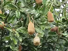 They are large trees, often rising above the rainforest canopy. The leaves are evergreen, alternate, simple, elliptical, up to 15 cm long, with a serrate to serrulate margin. Vernation lines parallel to the midvein are often visible - a very unusual characteristic. The fruit is 6–15 cm long, and roughly conical. A central plug drops out at maturity, releasing the winged seeds to be dispersed by wind. The fruit of Cariniana may be distinguished from those of Couratari, as the former have longitudinal ridges, whereas the latter bears a single calyx-derived ring near the fruit apex.[4][5]
