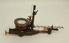 In 1916, Harry Wimperis started the design of a new bombsight, working in collaboration with Scarff.[1] This new Drift Sight included a simple system that greatly eased the measurement of the wind. By observing their movement over the ground, the aircraft would first determine the direction of the wind. The aircraft would then turn to fly at right angles to this wind direction so that the wind was pushing the aircraft sideways. Observing the sideways drift of the aircraft by comparing the motion of objects on the ground to a metal rod along the side of the bombsight, the drift could be seen. Using a knob, the rod was angled away from the side of the aircraft until objects could be seen moving directly along the line of the rod. A gear in the knob that adjusted the rod angle also drove the sights fore or aft, moving them to account for the wind speed. This eliminated the need for a stopwatch to measure the ground speed. However, the Drift Sight was still useful only for bomb runs along the wind line.[5]