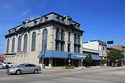 The Court Street Methodist Church is one of the most unusual commercial buildings in downtown Janesville. It is significant not only for the quality of its architecture, as the best preserved of two remaining Second Empire commercial buildings in the city, with a fine two-story raised sanctuary, but also for its unique function as a combined commercial and religious building, which represented a Victorian bringing-together of worship and commerce. It was constructed with retail store fronts on the ground story, and the sanctuary on the second and third floors. This arrangement was not unlike that utilized for the four story Methodist Church Block in Chicago, built on the southeast corner of Clark and Washington Streets in 1872 and razed for a new 21 story edifice in 1923. This Gothic style successor continues the combination arrangement to this day; its sanctuary is perched 20 floors up on top of a small skyscraper, and surmounted by an eight story spire.[1]