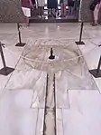 The hydraulic system of the fountain was also studied during the recent restoration process. In 1884, when the fountain's main basin was raised, a cylindrical marble bloc was discovered whose top was pierced by many holes.[34] In 1890, archeologist Francisco de Paula Valladar hypothesized that this piece was the means by which water originally spilled into the fountain's main basin. Based on the description provided by Ibn Zamrak's poem inscribed on the basin, he theorized that the holes were connected to a system of pipes that allowed water to flow both in and out of the basin at the same time. This system maintained a steady water level in the basin and prevented the surface of the water from being disturbed, as suggested by Ibn Zamrak's poem, which evokes the "solid" appearance of the water.[34] During the restoration work of the 1960s, experts were not yet able to implement this hydraulic system, therefore the fountain was left with a small water jet spouting water in the middle of the basin. In 1981 the original marble cylinder piece was removed for preservation and further study at the Alhambra Museum. In 2012, upon completing the restoration of the fountain, a replica of this cylindrical piece was installed in the fountain to replace the water jet, thus restoring the hydraulic system to its hypothesized original state.[34]