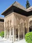 The Palace of the Lions is one of the most famous palaces in Islamic architecture and exemplifies the apogee of Nasrid architecture in Al-Andalus.[2] The architecture of the palace presented a significant shift in the design of Nasrid palaces and introduced new trends in ornamentation.[3][4] The building consists of a rectangular courtyard centered on a marble fountain with twelve sculpted lions. Four main halls surround the courtyard, along with some upper-floor rooms. Water channels connect the central fountain with smaller fountains in the four halls. The halls feature some of the most elaborate and sophisticated muqarnas vaults in the Islamic world.[5][6]