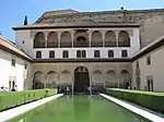 The Court of the Myrtles measures 23 to 23.5 metres wide and 36.6 metres long, with its long axis aligned roughly north-to-south.[23] At the middle, aligned with the axis of the court, is a wide reflective pool. The pool measures 34 metres long and 7,10 meters wide.[30] The myrtle bushes that are the court's namesake grow in hedges along either side of this pool. Two circular floor fountain are located at either end of the pool allow. The water from each fountain runs along a short channel towards the pool, but the channel is design to let the water slow and pause before emptying into the pool, thus reducing the formation of ripples and preserving the water's still surface. The effect of the water reflecting sunlight during the day as well as the image of the architecture around it is a crucial part of the aesthetic effect of this space.[31] Elongated rectangular courtyards with a central water basin were already an established feature of Nasrid architecture that is evident in older palaces of the Alhambra, in particular the Palacio del Partal Alto.[23] At the south and north ends of the courtyard are ornate porticos consisting of a wide central arch flanked by three smaller arches on either side. The arches are richly decorated with stucco sculpted in arabesque (vegetal), sebka, and epigraphic motifs. This decoration, like that of the halls behind them, dates from the time of Muhammad V, probably between 1362 and 1367.[23] The gallery spaces behind the porticos are flanked at their east and west ends by decorative niches covered with muqarnas vaulting.[23]