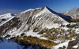 Courtney Peak is an 8,392-foot (2,558-metre) mountain summit located in the Methow Mountains, a sub-range of the North Cascades in Washington state. Situated on Sawtooth Ridge, Courtney Peak is part of the Lake Chelan-Sawtooth Wilderness, a protected area within the Okanogan–Wenatchee National Forest. Courtney Peak ranks 78th on Washington's highest 100 peaks, and 81st on the "Bulger List".[1] The nearest higher peak is Star Peak, 0.83 miles (1.34 km) to the southeast.[1] Precipitation runoff on the west side of the mountain drains into nearby Lake Chelan via Fish Creek, whereas the north side of the mountain drains into Oval Creek, and the east side drains into Buttermilk Creek, both of which are tributaries of the Twisp River. The mountain's name was officially adopted in 1985 to remember James (Ray) Courtney (1920-1982), a commercial packer and lifelong resident of Stehekin.[4] The immediate vicinity of this peak was a favorite destination for his guided outings. Ray Courtney died in an accident while leading such a pack trip with 29 hikers when the horse he was riding lost its footing and fell down a gully.[4]