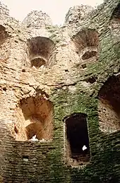 Cow Tower is a three-story circular building with a protruding turret, the main building being 11.2 metres (37 ft) across and 14.6 metres (48 ft) tall, tapering towards the top.[35] Its walls, 1.8 metres (5 ft 11 in) thick at the base, are made of a core of flint stone, faced on the inside and outside with brick, and various putlog holes can still be seen in the walls.[35] The turret, which contained a spiral staircase, would originally have been higher than the parapets, forming a look-out position.[32] The walls rest on a stone plinth and several layers of mortared flint.[35]