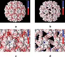 The figure on the right illustrates CCMV in acidic conditions (a) and CCMV as the pH changes and swelling occurs (b), this allows for electrostatic interactions, further enhancing the virus's ability to infect a host.