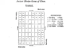 The theory arose from an article by Hiram Cox published posthumously in Asiatic Researches in 1801. Cox's article was a commentary on an earlier article written by Sir William Jones, which included an account of the Indian text Bhavishya Purana, which he believed to date from c.3000 BC. Jones stated that this contained a description of a four-player version of chess, presented in the form of a dialogue between Yudhishthira and Vyasa.[4] Jones argued that the four-player version described was a variation of the original two-player form of the game. Cox's article, "On the Burmha Game of Chess Compared to the Indian", proposed that the four-handed version of the game was the earliest form of chess. He states that this version "is mentioned in the oldest law books and is said to have been invented by the wife of Ravan",[5] referring to Ravana, the legendary king of Sri Lanka. Cox dates Ravan to "three thousand eight hundred years ago".[5]