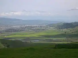 Coyote Valley is a floodplain approximately 11.2 kilometres (7.0 mi) and 3.2 kilometres (2.0 mi) wide, situated in a narrow constriction in Santa Clara Valley between the Diablo Range to the east and the Santa Cruz Mountains to the west. It contains the largest freshwater wetland in Santa Clara County, Laguna Seca, a mostly seasonal lake important to groundwater recharge.[6] Coyote Valley was named a “2001 Last Chance Landscape of America the Beautiful", one of the ten most endangered American landscapes by Scenic America.[7] The only landscape selected from California, Scenic America described Coyote Valley as: “Coyote Valley is a rare scenic break in an otherwise urbanized area... The rolling hills, blossoming orchards, and grand oaks provide respite to visitors, residents, and myriad species of wildlife."[8]