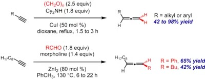 Shengming Ma (麻生明) and coworkers at the Shanghai Institute of Organic Chemistry (SIOC, Chinese Academy of Sciences) investigated the reaction in detail, including clarifying the critical role of the base, and developed conditions that exhibited superior functional-group compatibility and generally resulted in higher yields of the allene. One of the key changes was the use of dicyclohexylamine as the base.[5] In another important advance, the Ma group found that the combination of zinc iodide and morpholine allowed aldehydes besides formaldehyde, including benzaldehyde derivatives and a more limited range of aliphatic aldehydes, to be used as coupling partners, furnishing 1,3-disubstituted allenes via an alkyne-aldehyde coupling method of substantial generality and utility.[6] A separate protocol utilizing copper catalysis and a fine-tuned amine base was later developed to obtain better yields for aliphatic aldehydes.[7]